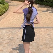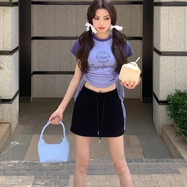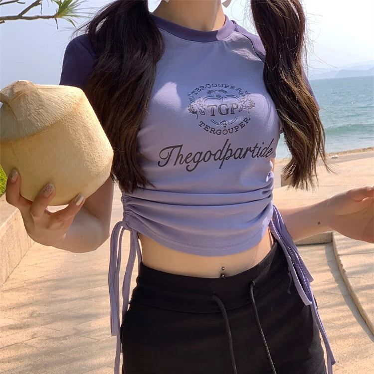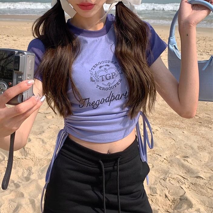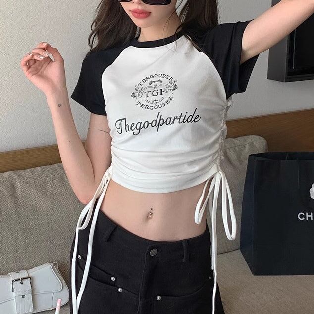 ラグラン クロップド Tシャツ レディース 韓国 サイドリボン 夏トップス バイカラー ロゴ グラフィック T ドローストリングス