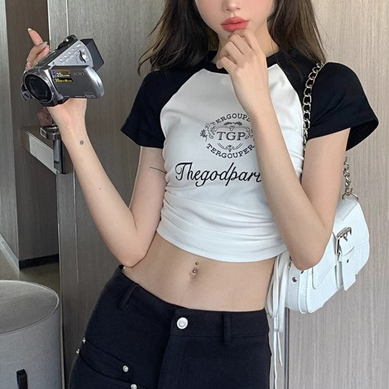 クロップドTシャツ ラグラン レディース 韓国 ファッション サイドリボン 夏トップス? バイカラー ロゴプリント ドローストリングス