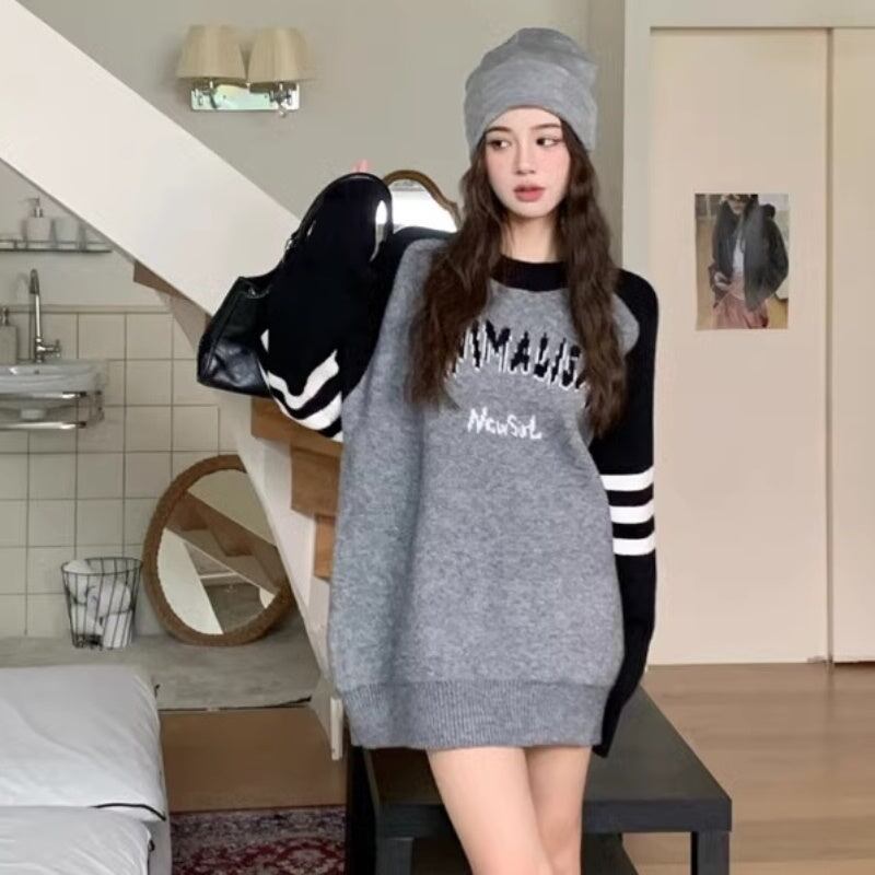 ニット レディース 韓国 ファッション ラグラン ライン袖 バイカラー ロゴ 秋冬トップス アメカジ おしゃれ かわいい メンズライク ユニセックス