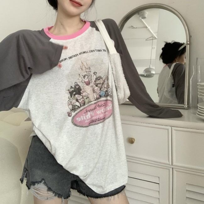 Tシャツ 長袖 レディース 韓国 ファッション キャラプリント レトロ ナチュラル ガーリー ロゴ プリント カジュアル トップス 薄手