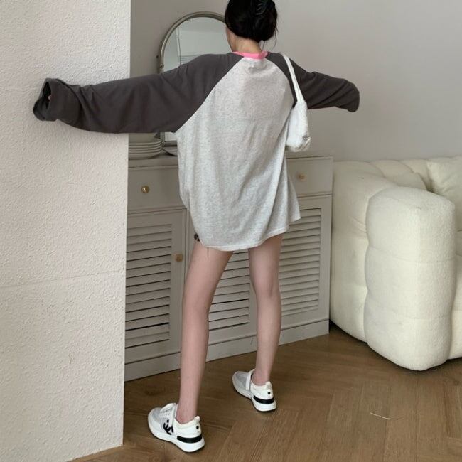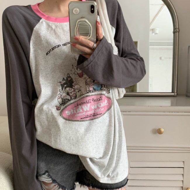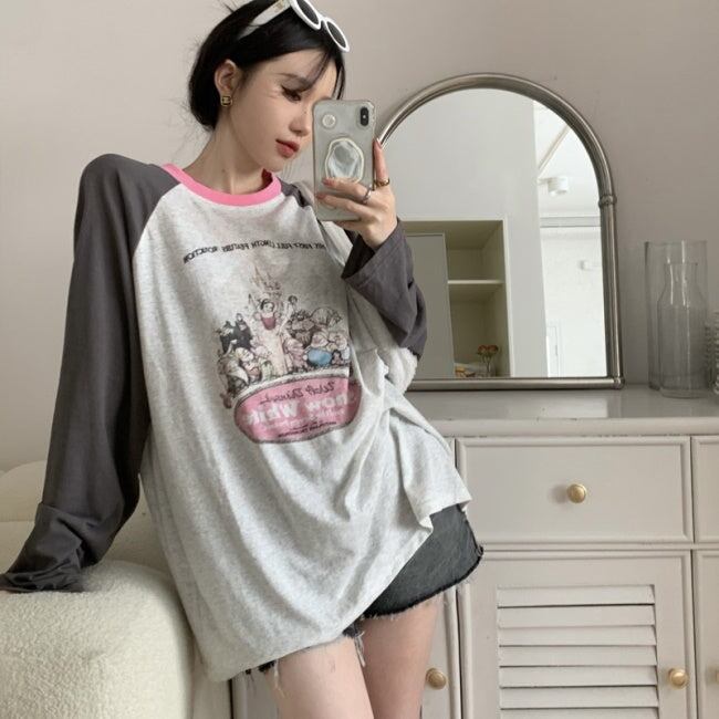 ラグラン ロンT レディース 韓国 ファッションビッグシルエット キャラプリント ロングTシャツ