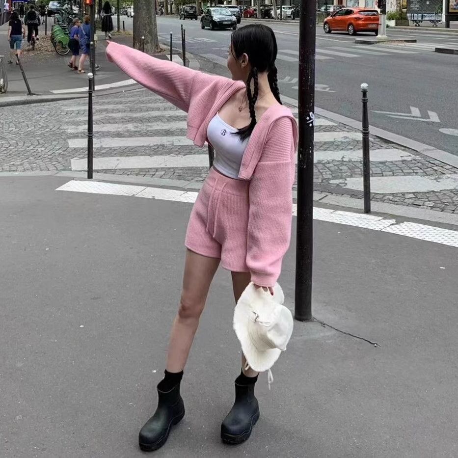 セットアップ レディース 韓国 ファッション リブニット ニットソー ジップジャケット ショートパンツ 上下セット 春コーデ ガーリー 無地