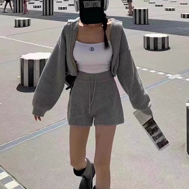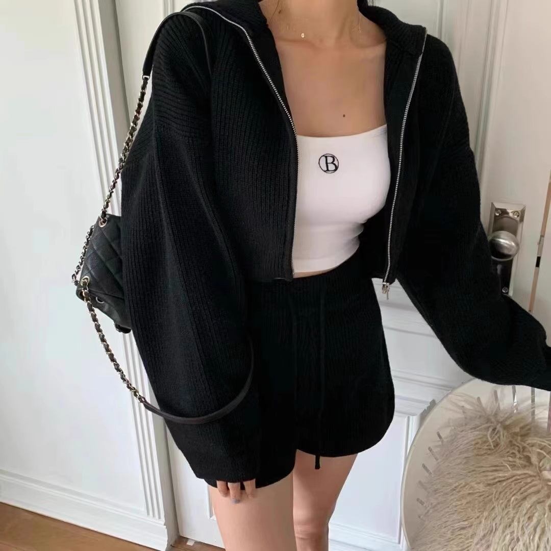 リブニット セットアップ レディース 韓国 ファッション ジップジャケット ショートパンツ 上下セット 春コーデ