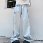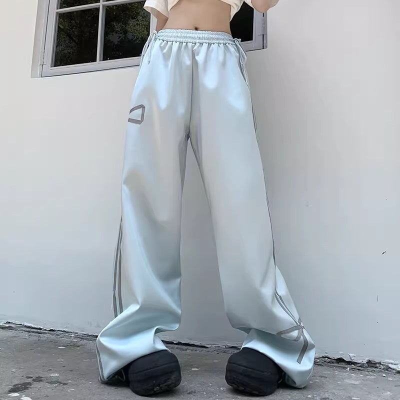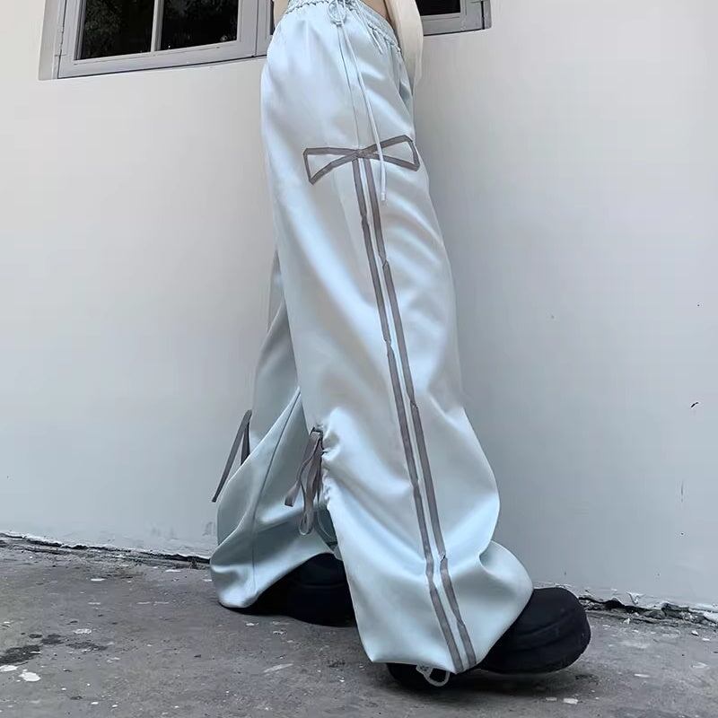 ラインジャージパンツ リボン バックシャン レディース 韓国 ファッション ガーリー ストリート 光沢 ライトブルー 太めパンツ モップパンツ