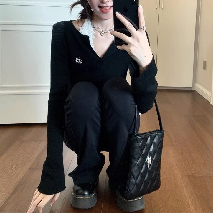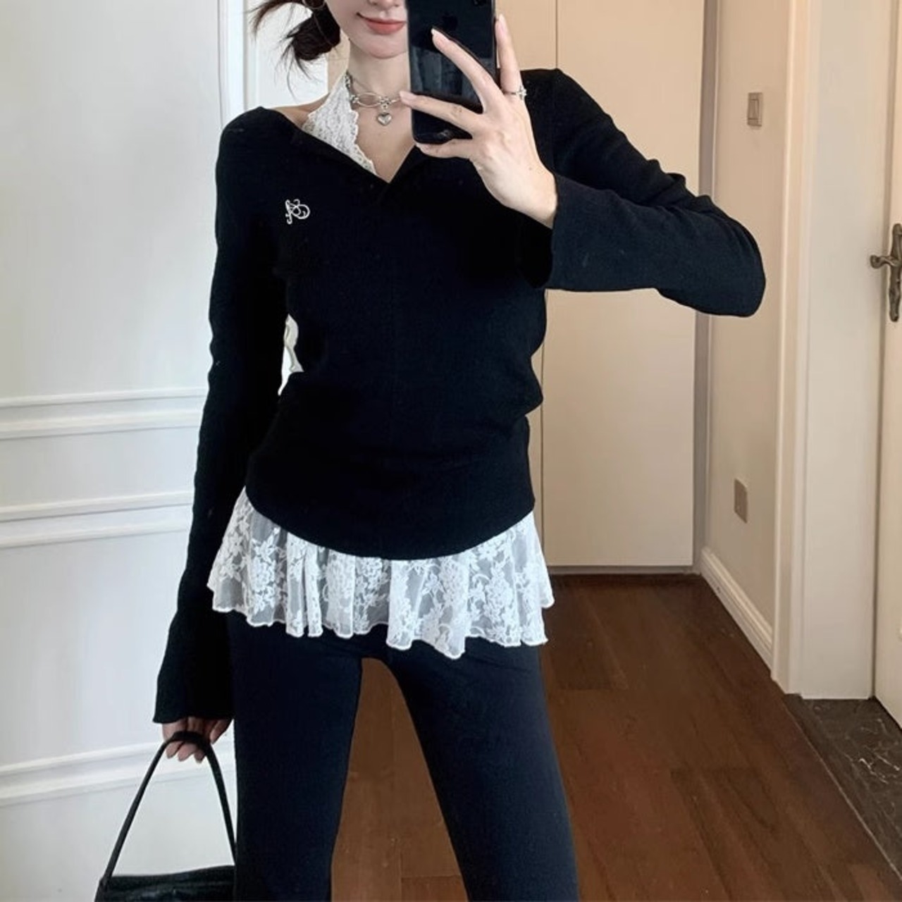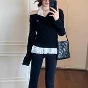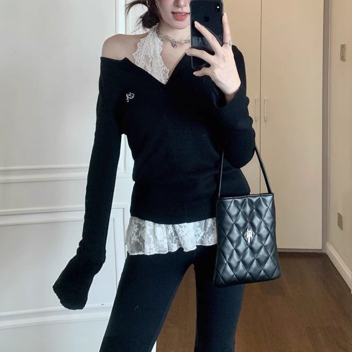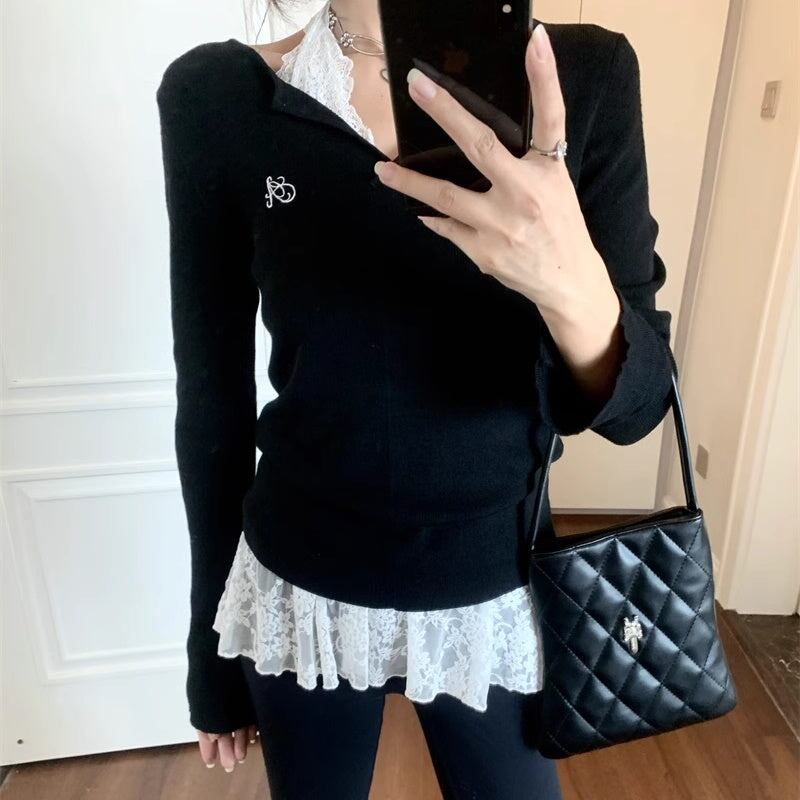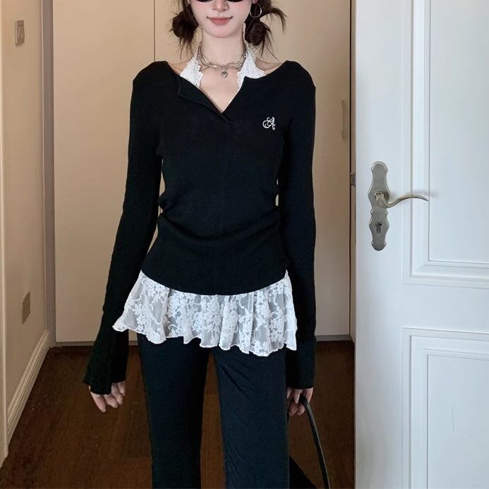 レイヤード ニット トップスセット レディース 韓国 ファッション タイト リブニット カットソー レースブラウス 重ね着 コーデ
