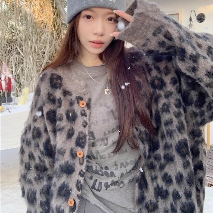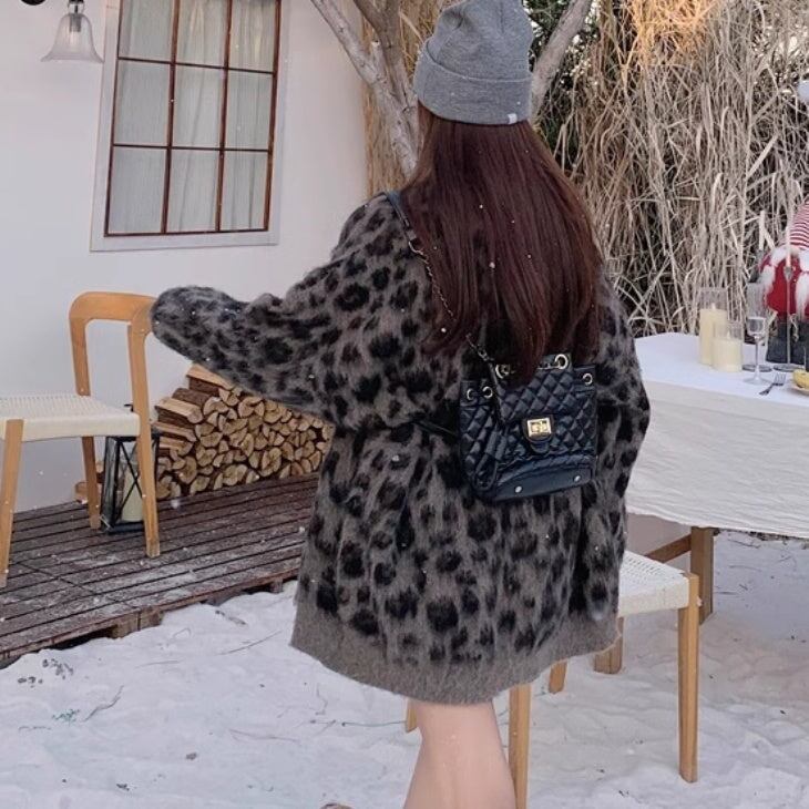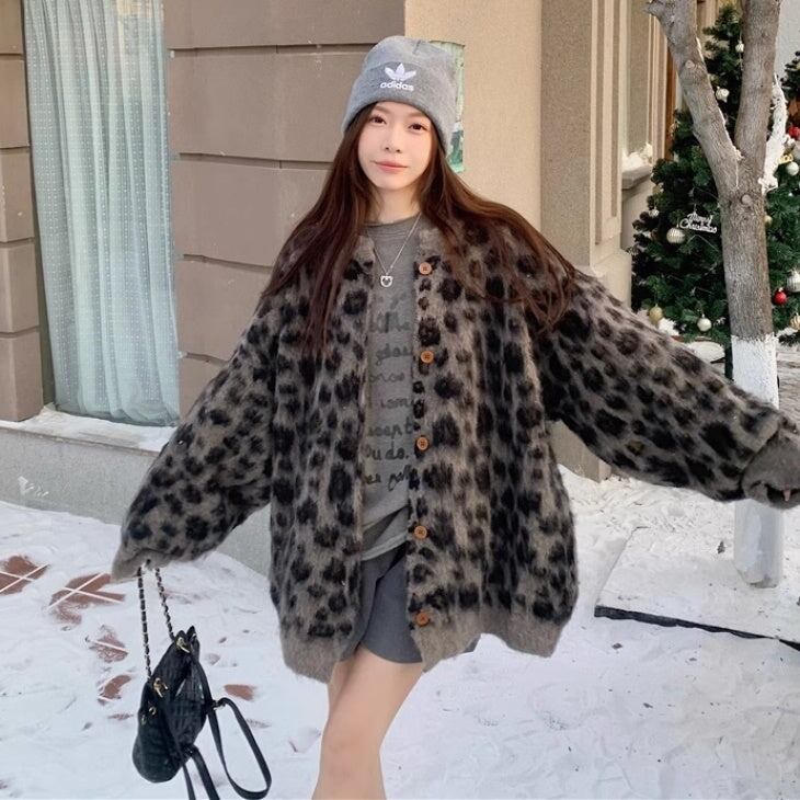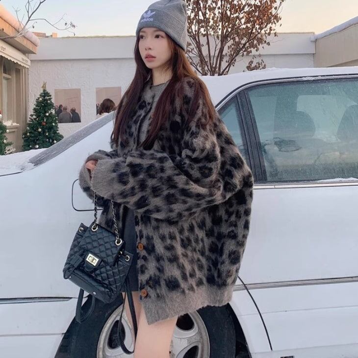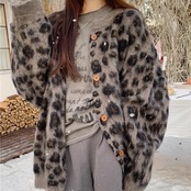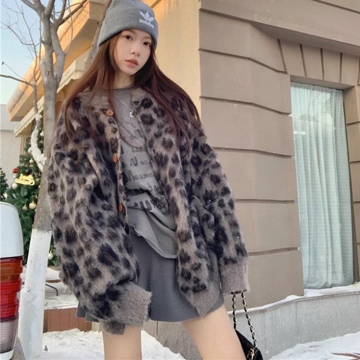 カーディガン レオパード レディース 韓国 ファッション オーバーサイズ ビッグシルエット ニットトップス ニットアウター ヒョウ柄 アニマル かわいい ガーリー