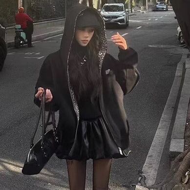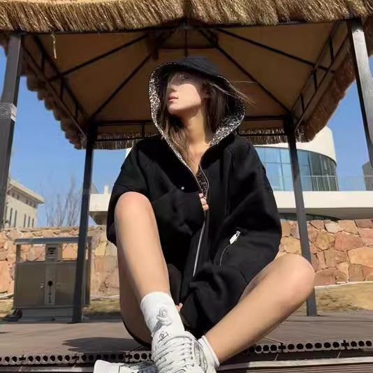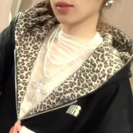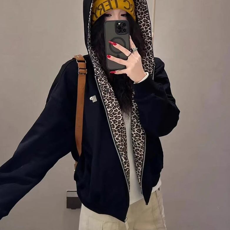 ジップアウター レオパード柄 レディース 韓国 ファッション アニマル ヒョウ柄 ワンポイントロゴ 春アウター シック カジュアル 黒ジャケット フードジャケット
