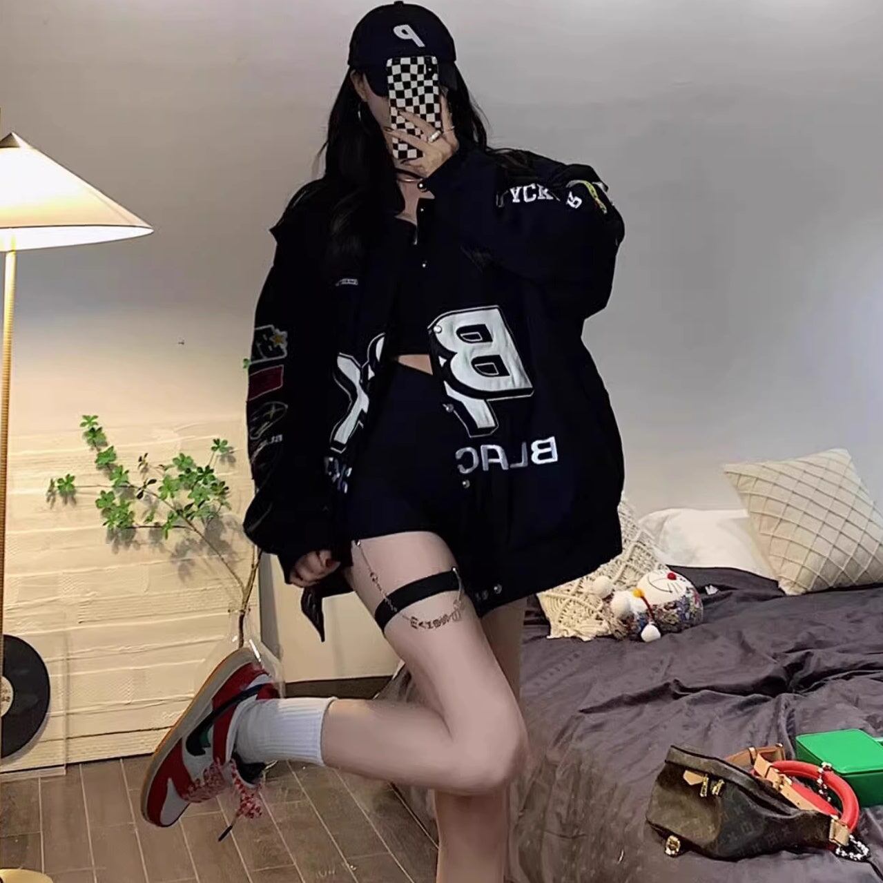 レーサー ジャケット レディース 韓国 ファッション ワッペン ロゴ ビッグシルエット 秋冬 ブルゾン