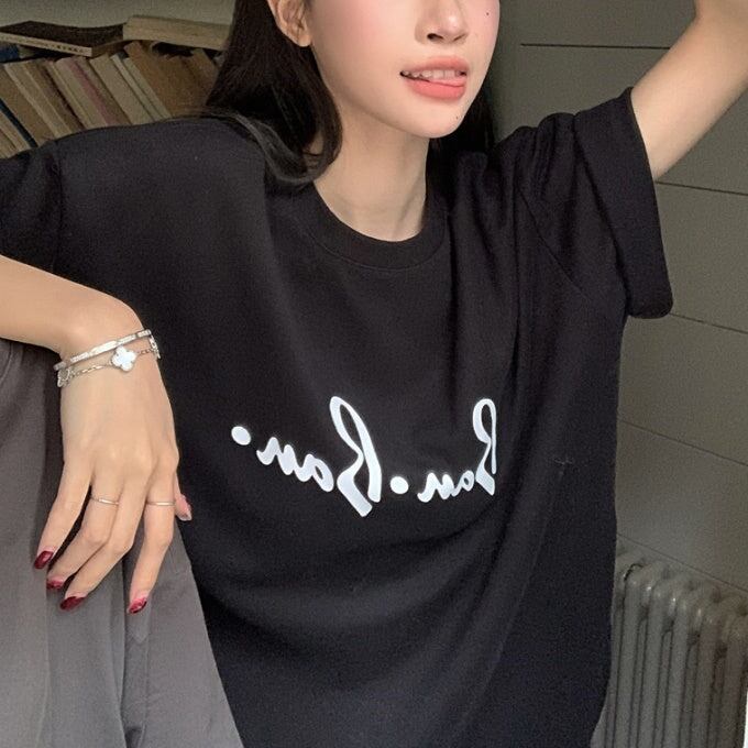 ロゴ Tシャツ レディース 韓国 プリント グラフィック T 白黒 夏トップス オーバーサイズ モノトーン シンプル