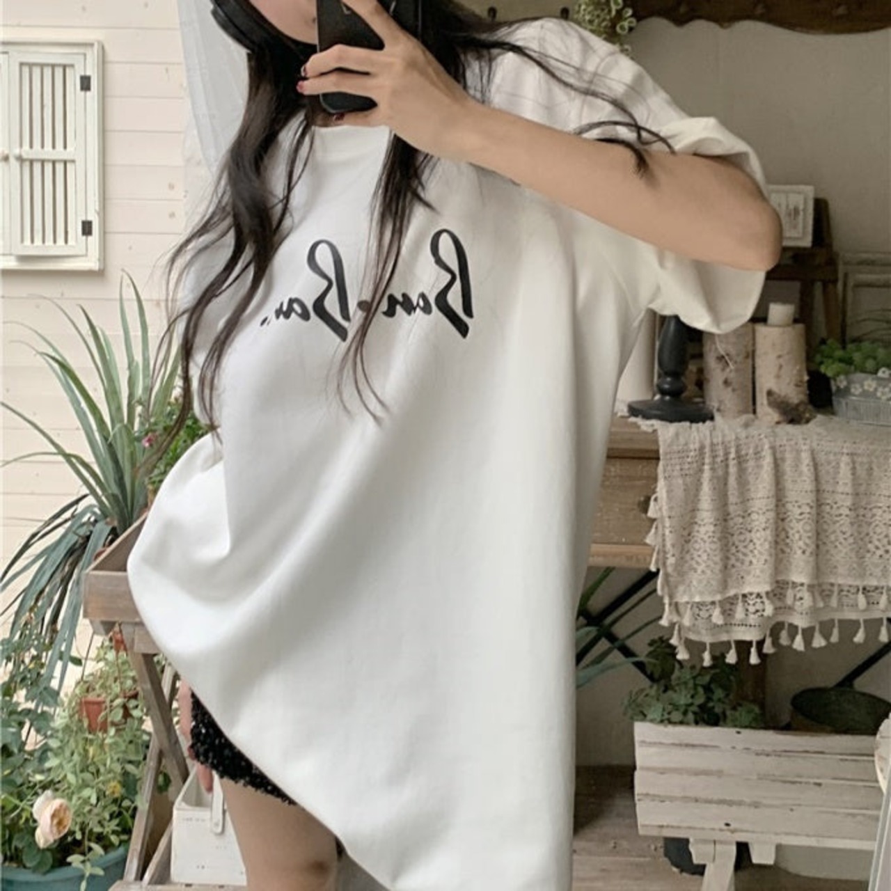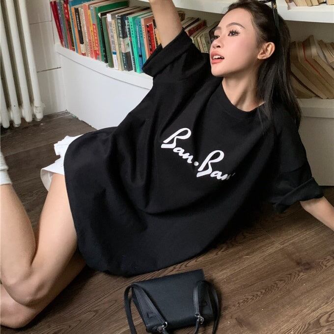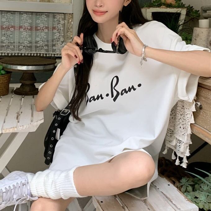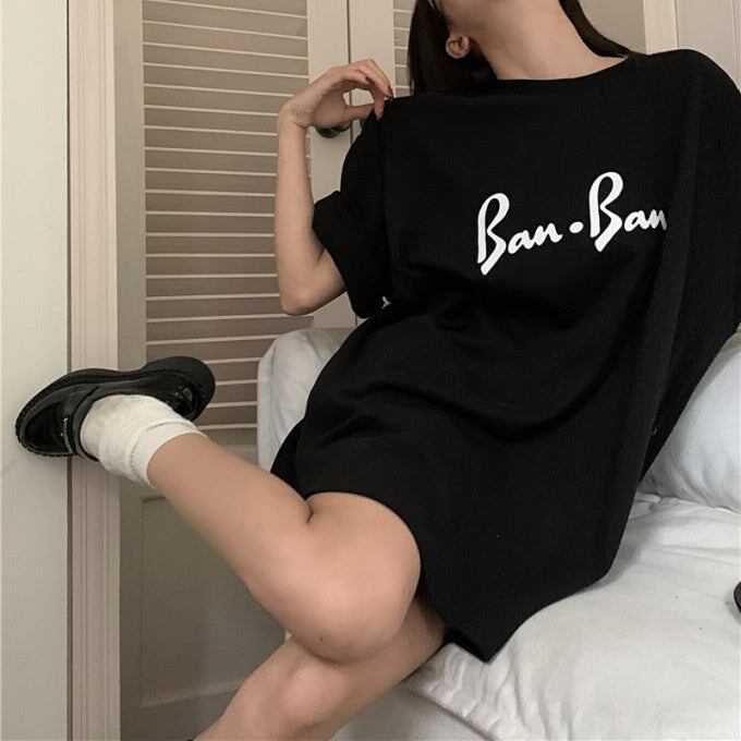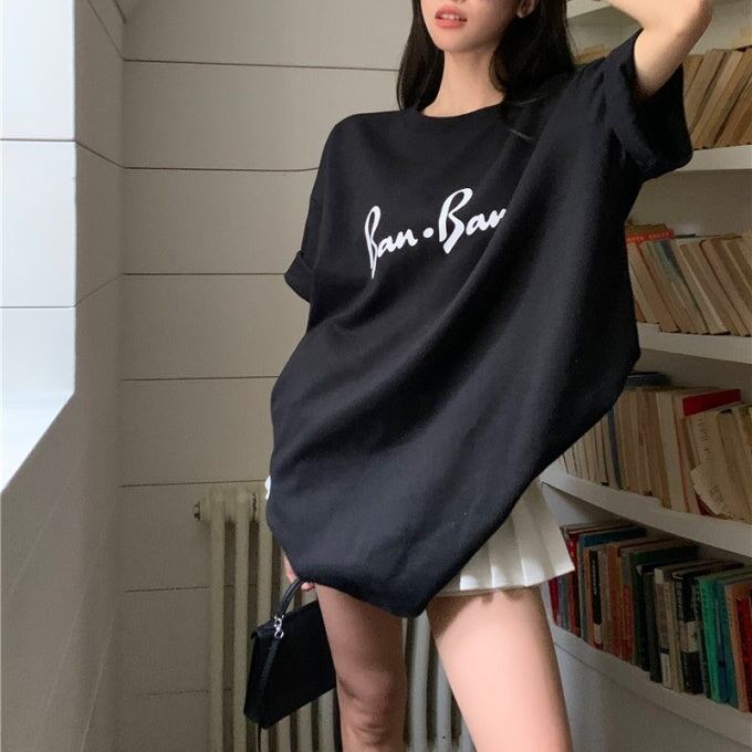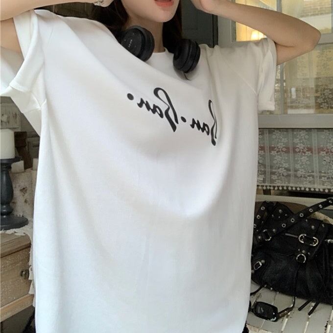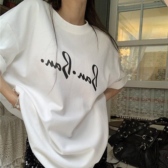 Tシャツ ビッグシルエット レディース 韓国 ファッション 手書き風ロゴ プリント 白黒 夏トップス ロング丈 オーバーサイズ モノトーン シンプル