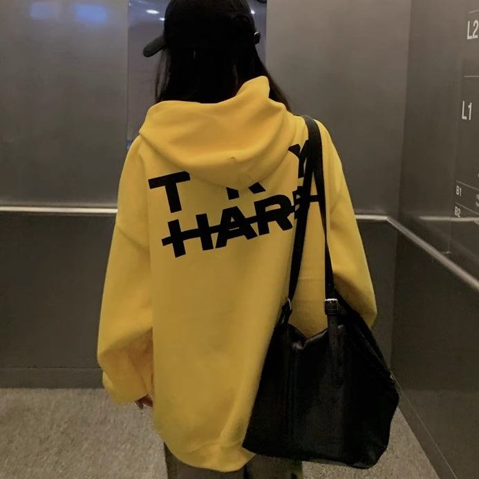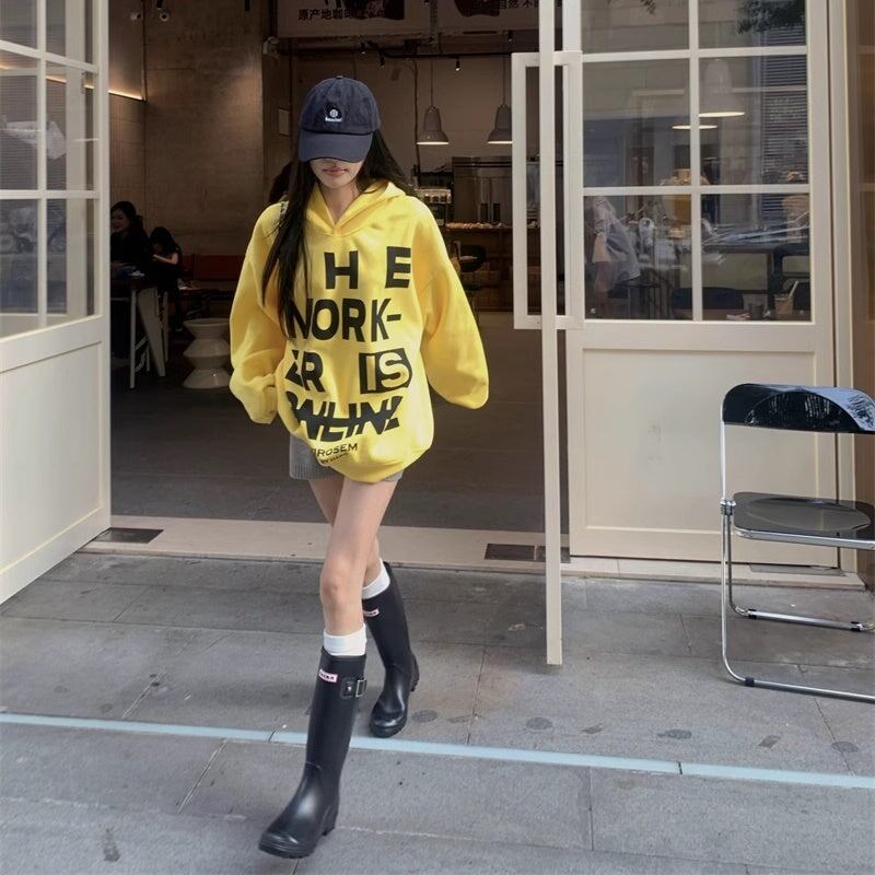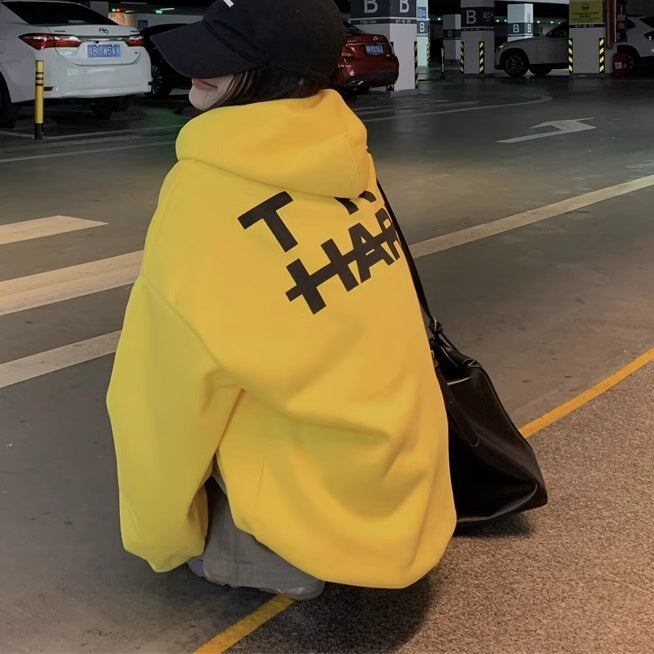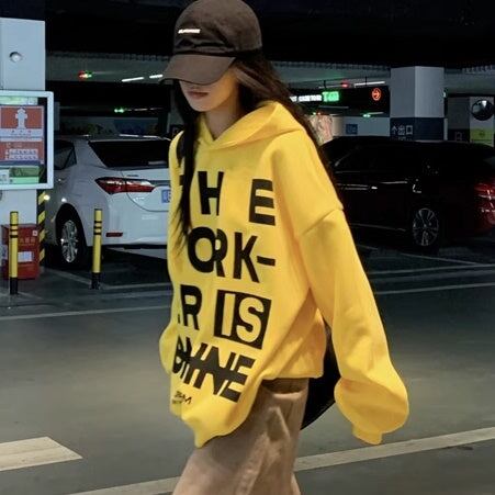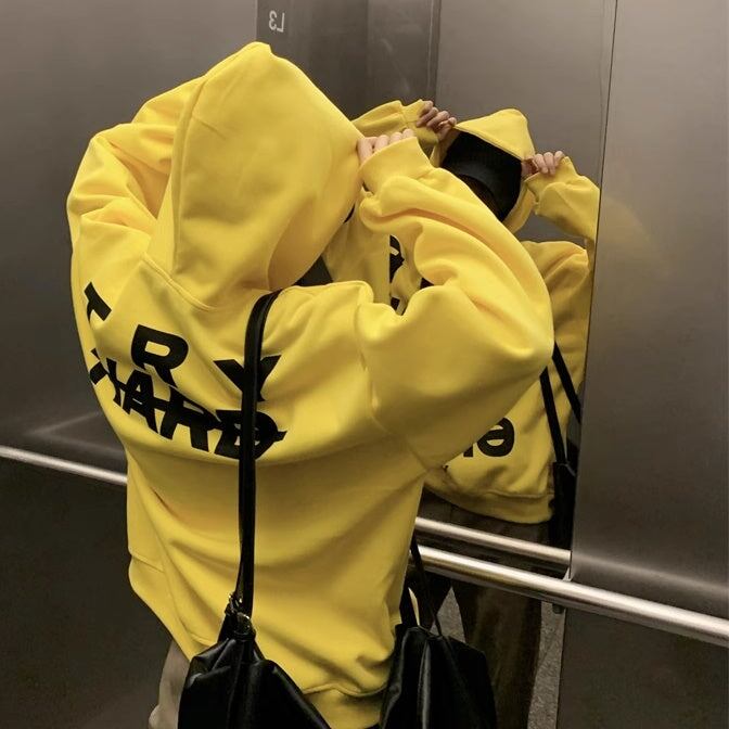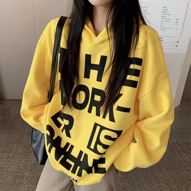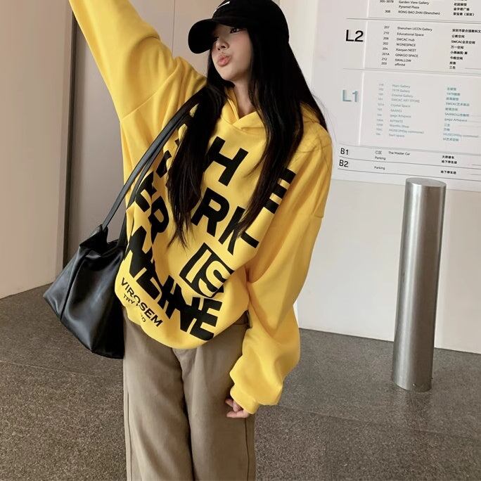 ロゴ グラフィック ビッグ パーカー プルオーバー レディース 韓国 ファッション ロゴプリント イエロー フード スウェット トップス