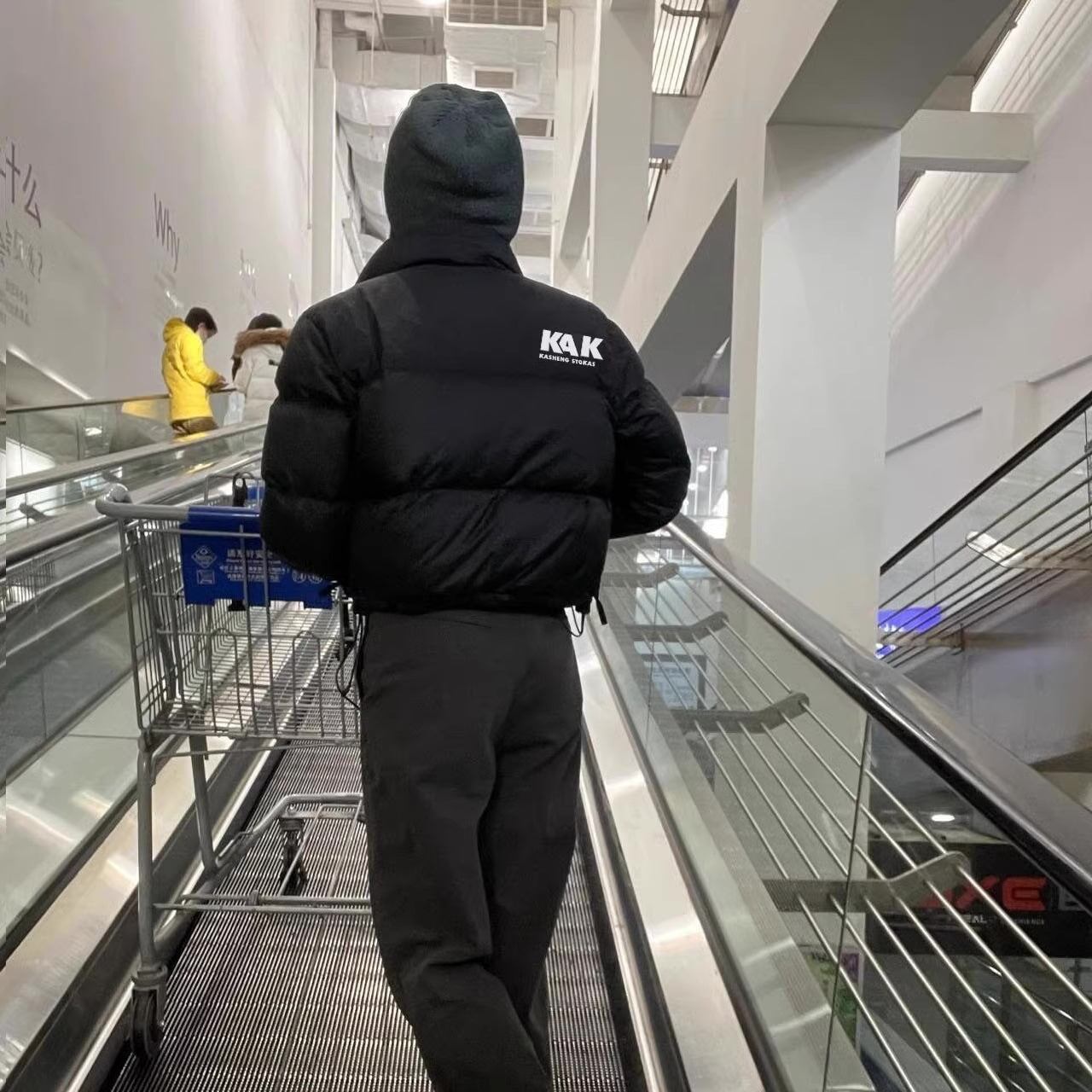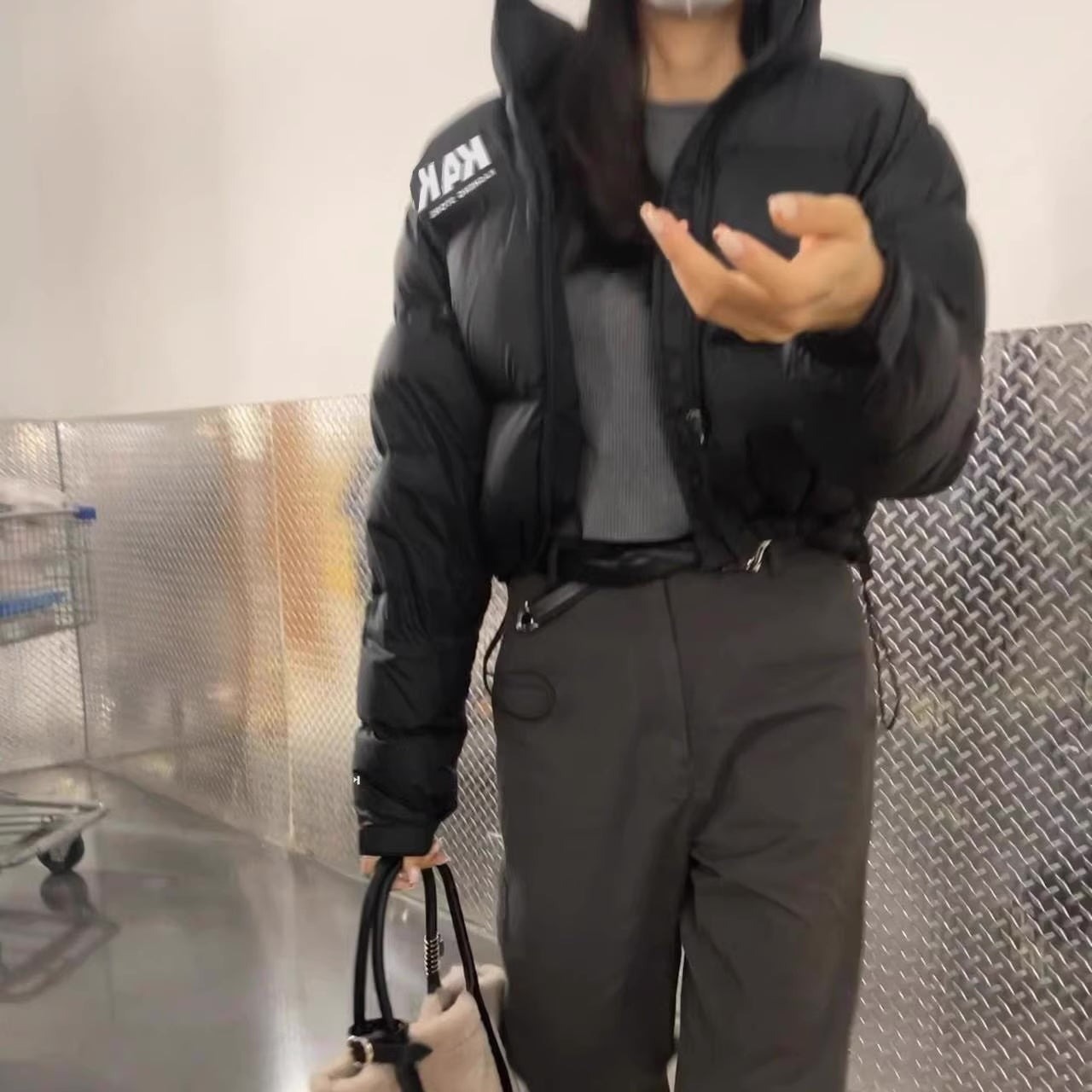 エコダウンジャケット レディース 韓国 ファッション ボリューム パデットジャケット ロゴ バックロゴ ショートダウン ジャケット バイカラー 黒アウター 防寒