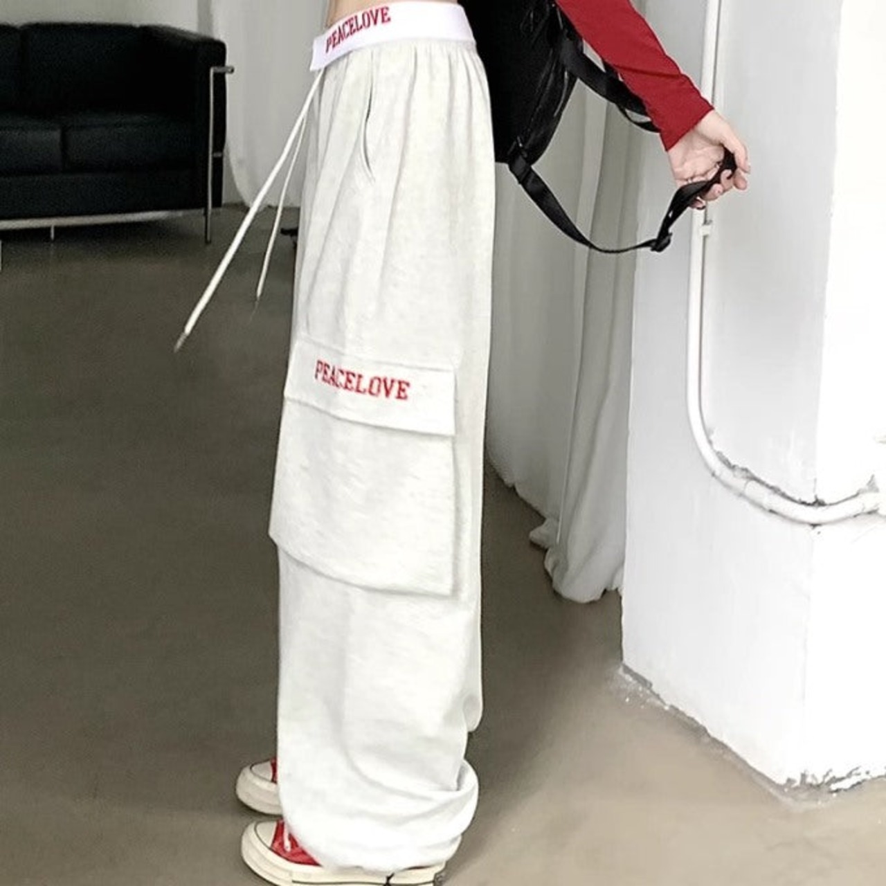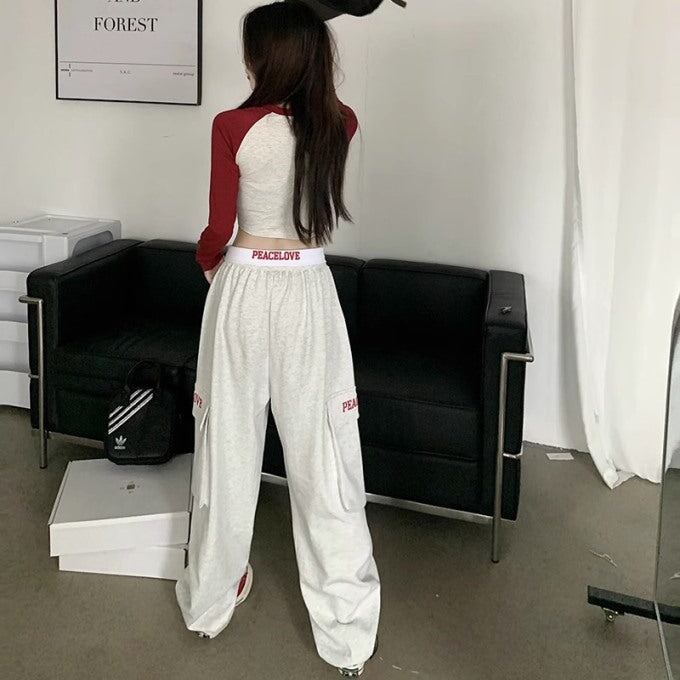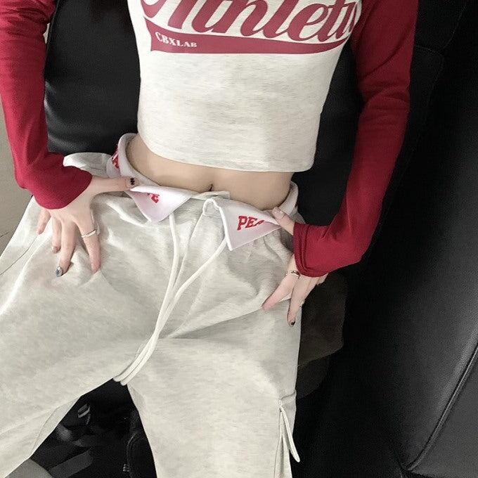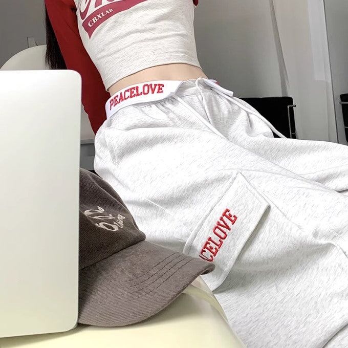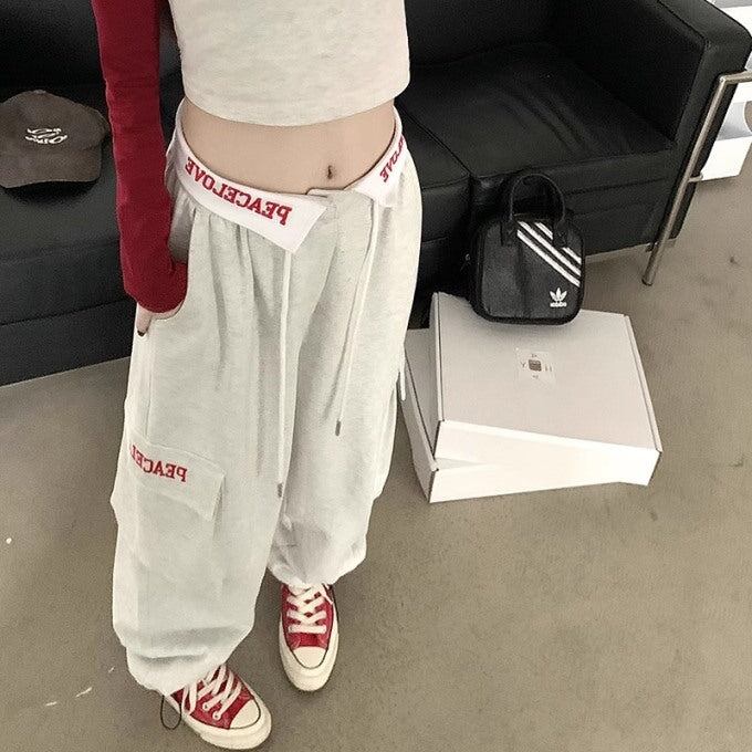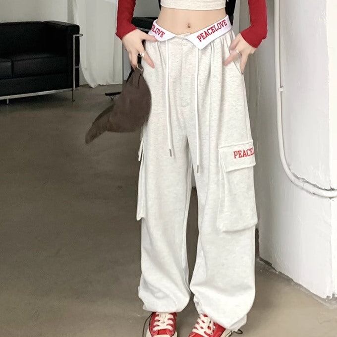 ロゴ スウェット カーゴパンツ レディース 韓国 ファッション ウエスト折り返し ロゴパンツ サイドポケット ワイドパンツ 太めパン ストリート カジュアル