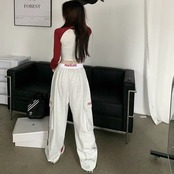 カーゴパンツ レディース 韓国 ファッション ウエスト折り返し ロゴパンツ サイドポケット ワイドパンツ 太めパンツ 白パンツ ストリート カジュアル