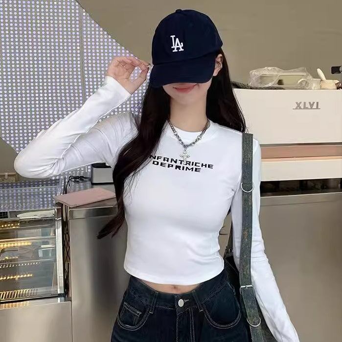 ロゴ タイト ロングTシャツ レディース 韓国 ファッション カットソー ストレッチ ロンT ミニマム クロップド ショート丈 タイトシルエット