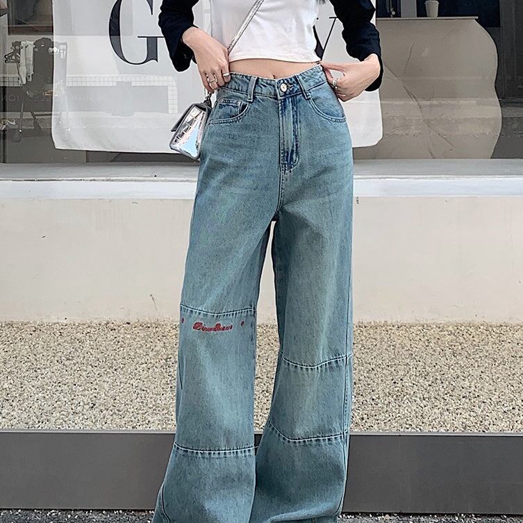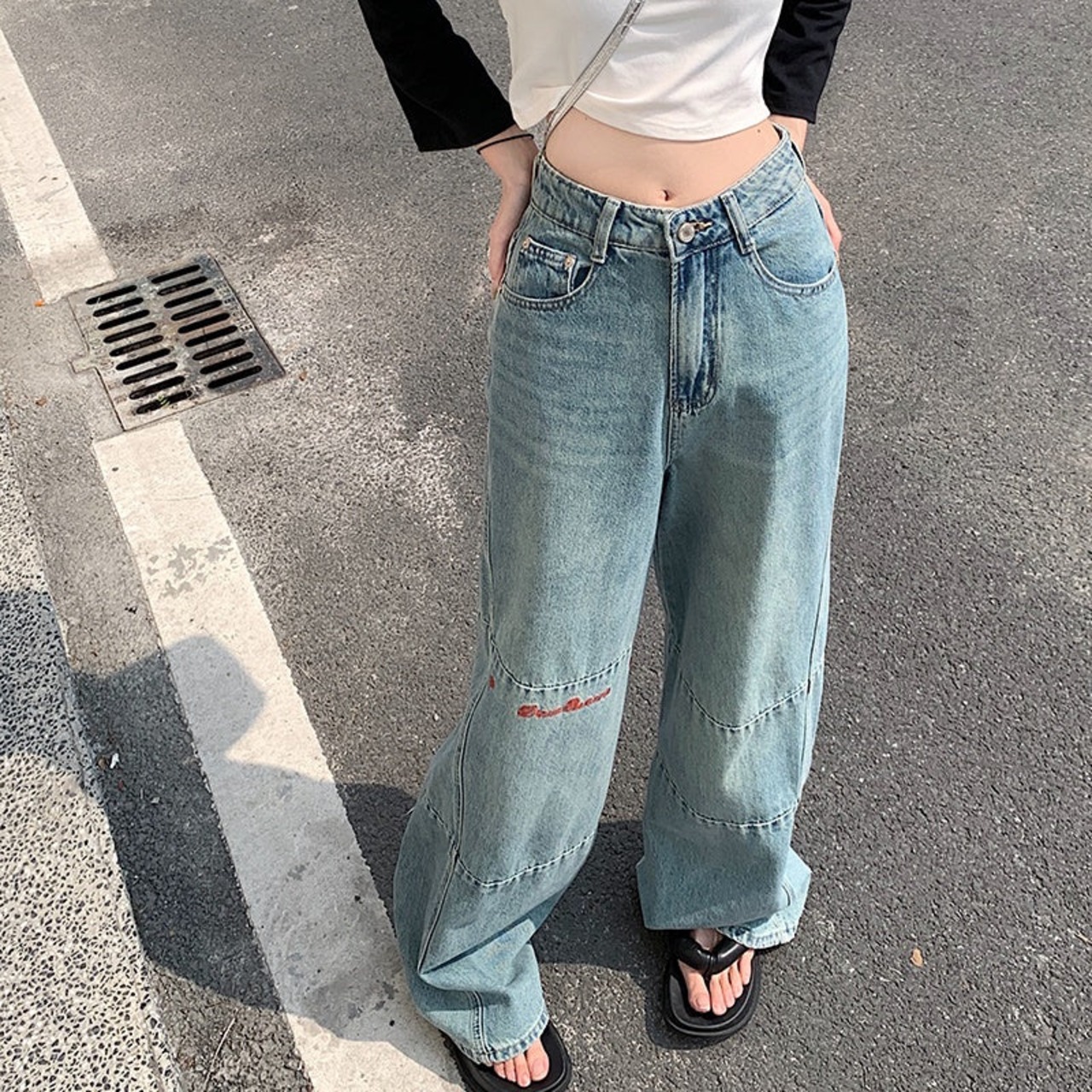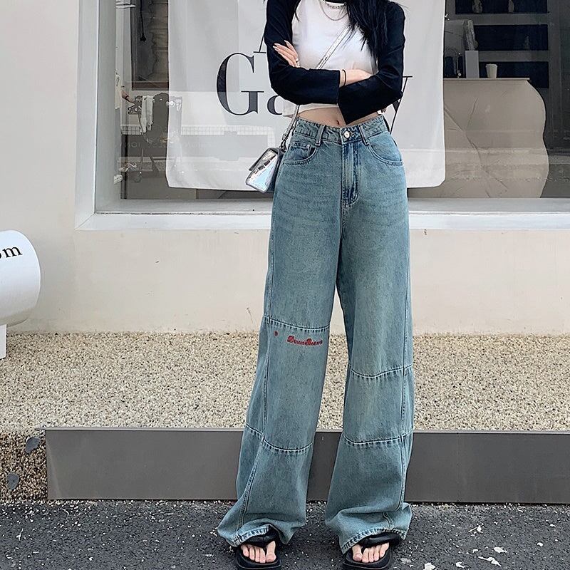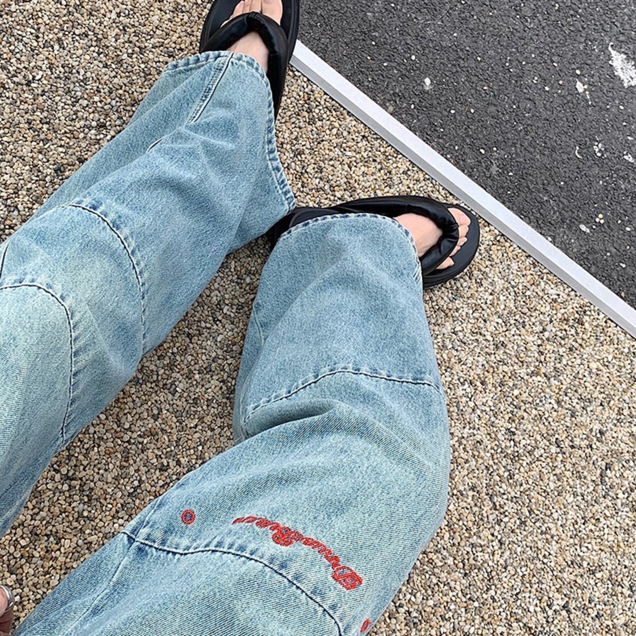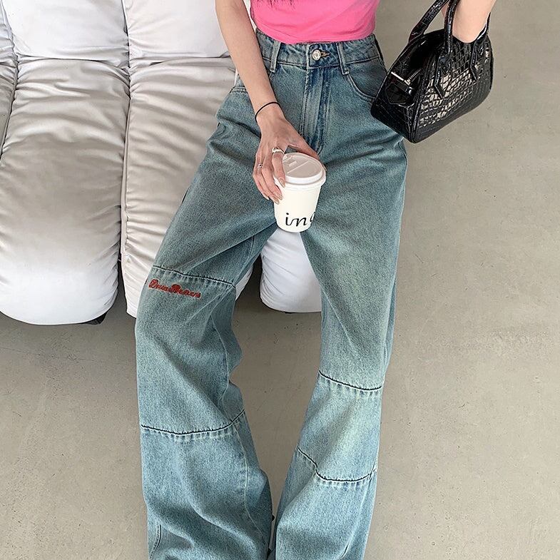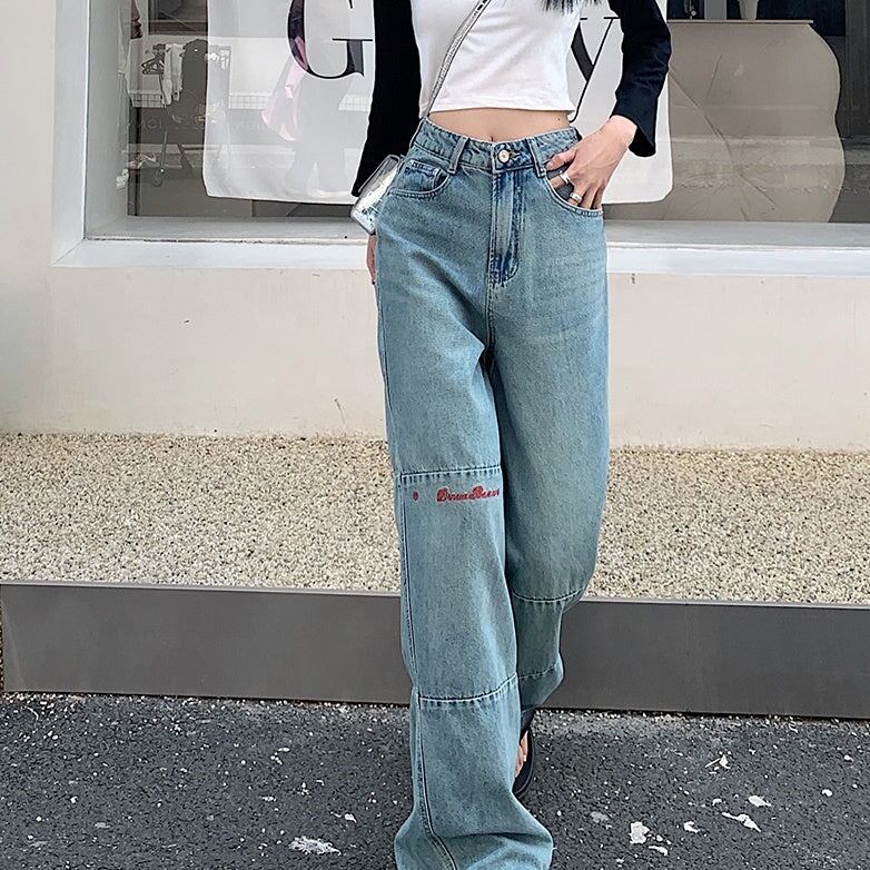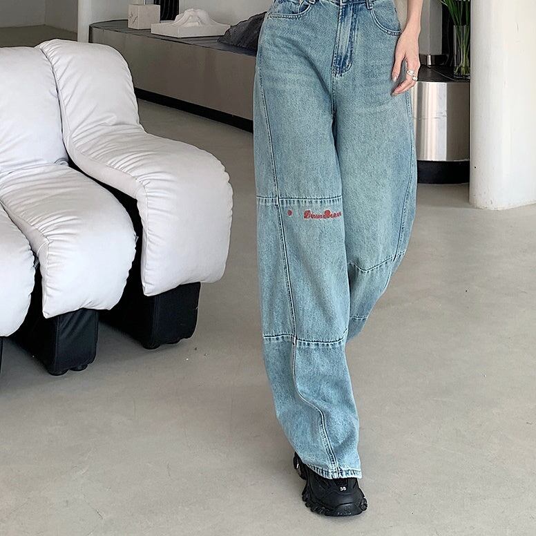 デニムパンツ 刺繍ロゴ レディース 韓国 ファッション ワイドパンツ モップパンツ カジュアル 切り替え デニム