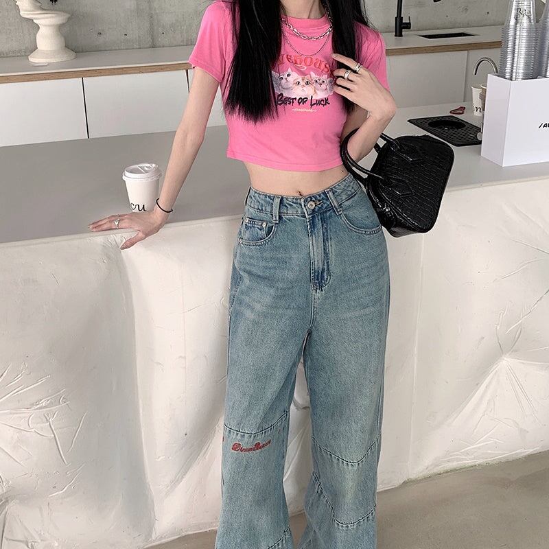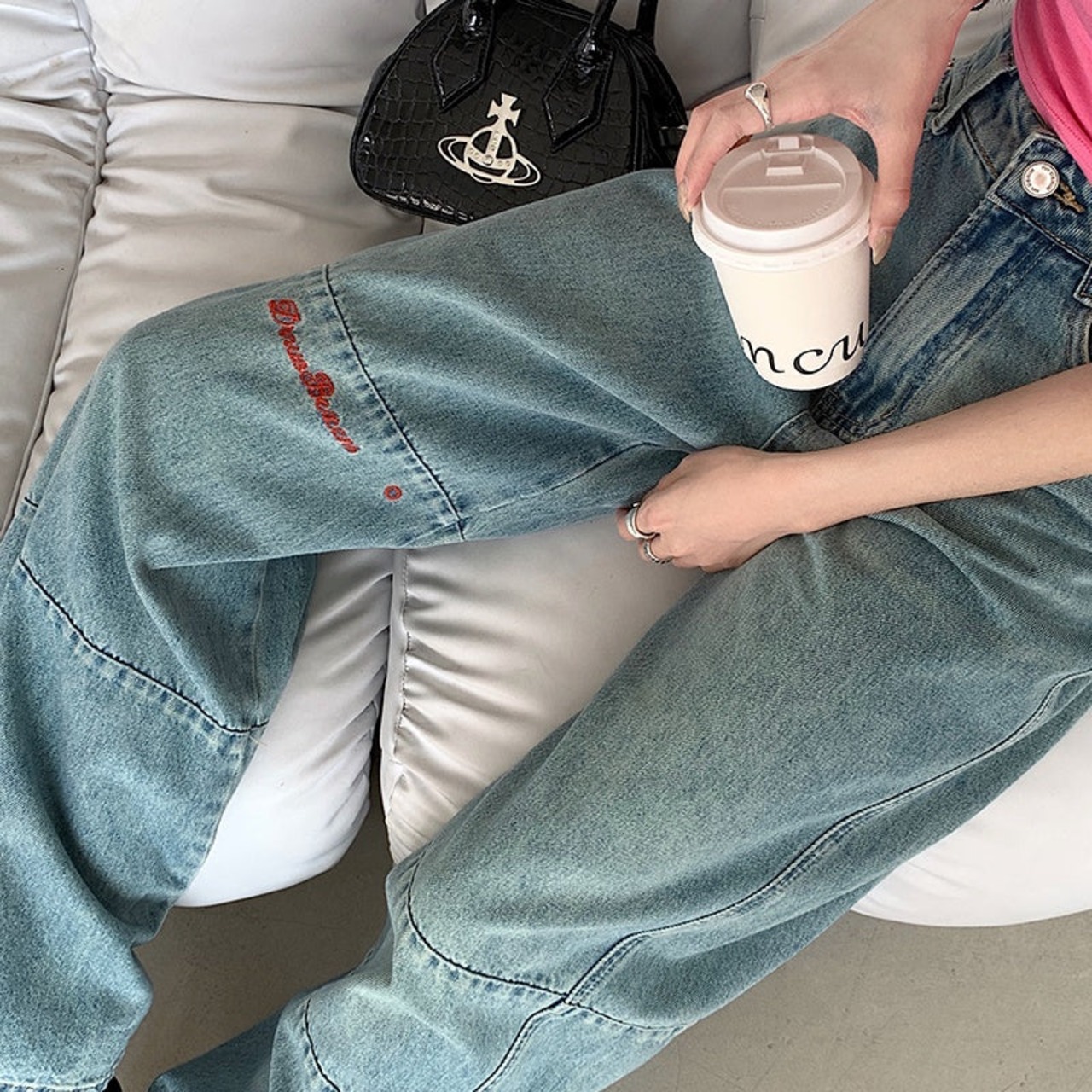 ロゴ デニムパンツ レディース 韓国 ファッション デニム ワイドパンツ ストリート ファッション