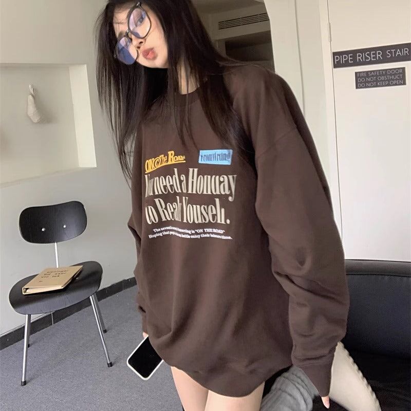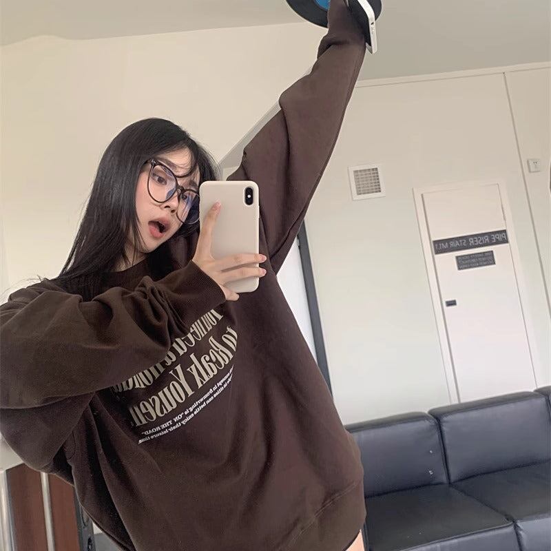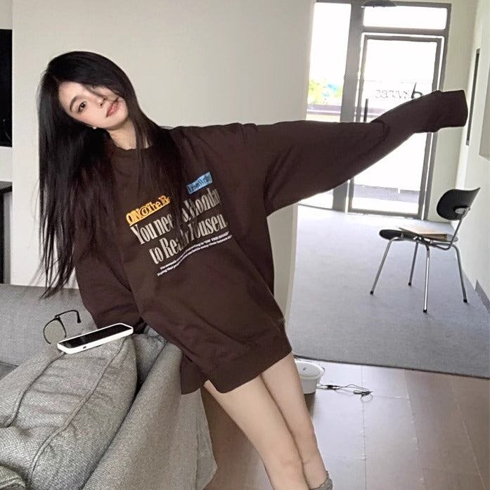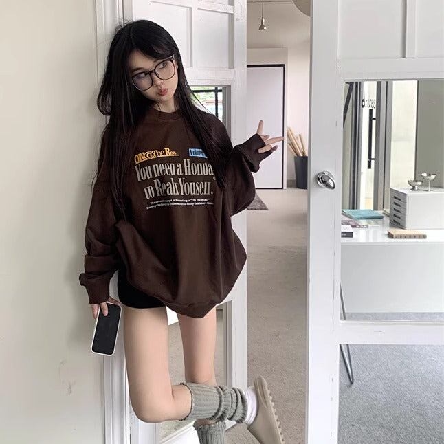 ロゴ トレーナー レディース 韓国 ファッション グラフィック オーバーサイズ スウェット トップス メッセージ ロゴ ブラウン/ブラック