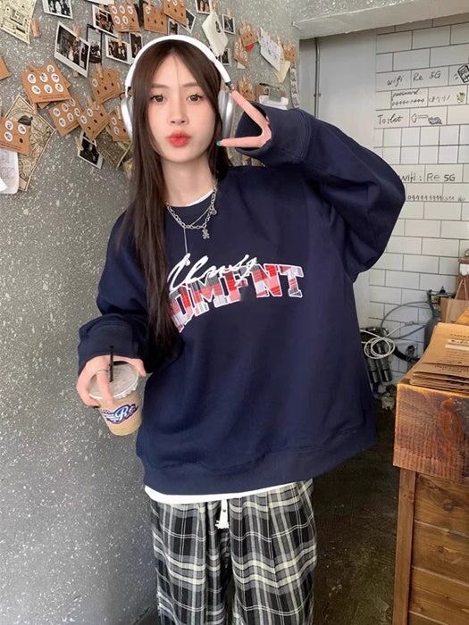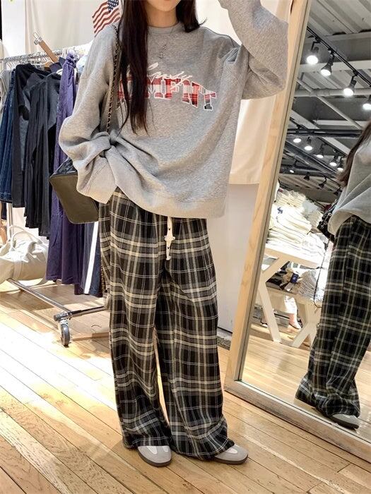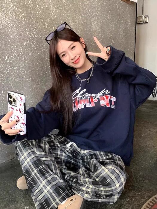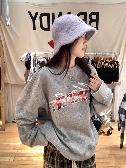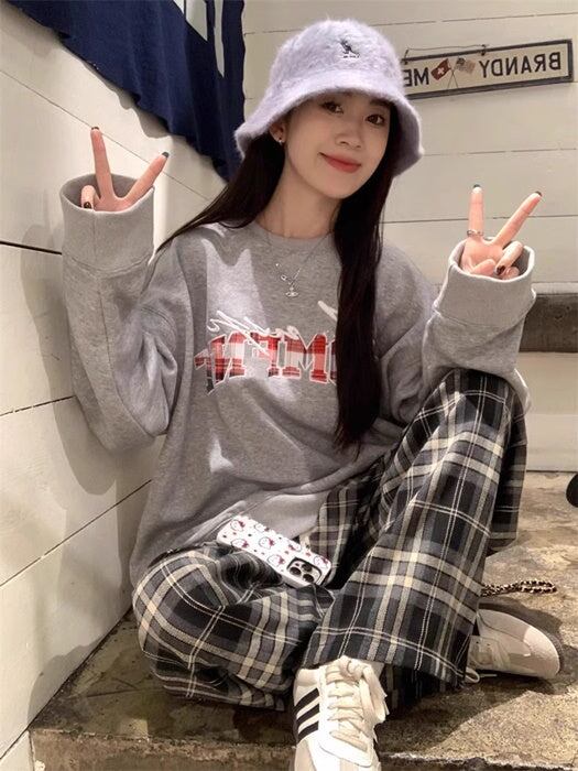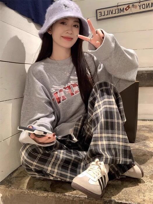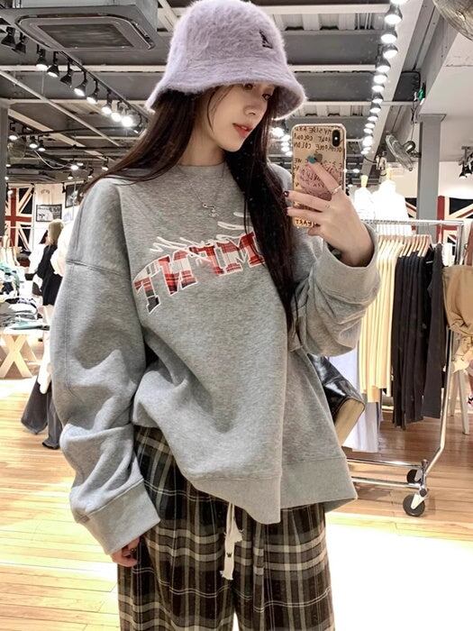 ロゴ トレーナー レディース 韓国 ファッション チェック ビッグシルエット ロゴ スウェット シャツ