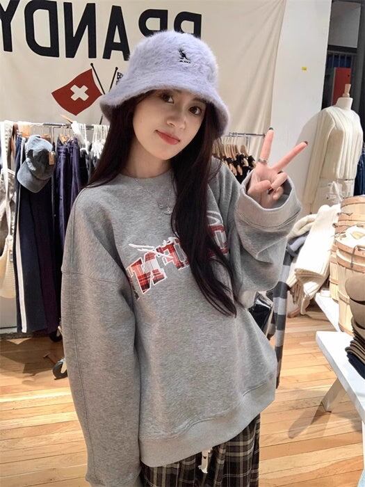 スウェット ロゴトレーナー レディース 韓国 ファッション チェック 柄ロゴ おしゃれ 刺繍 パッチワーク チェック柄 厚手 裏起毛 プルオーバー 秋冬 トップス