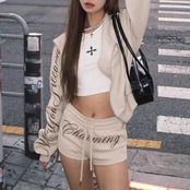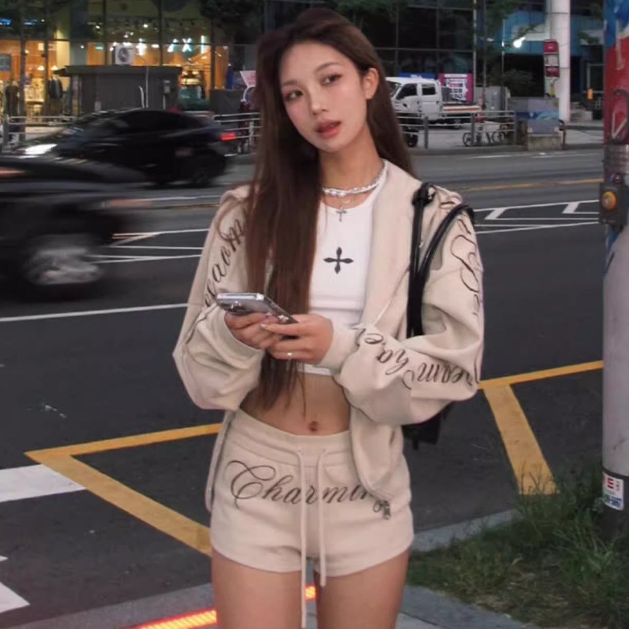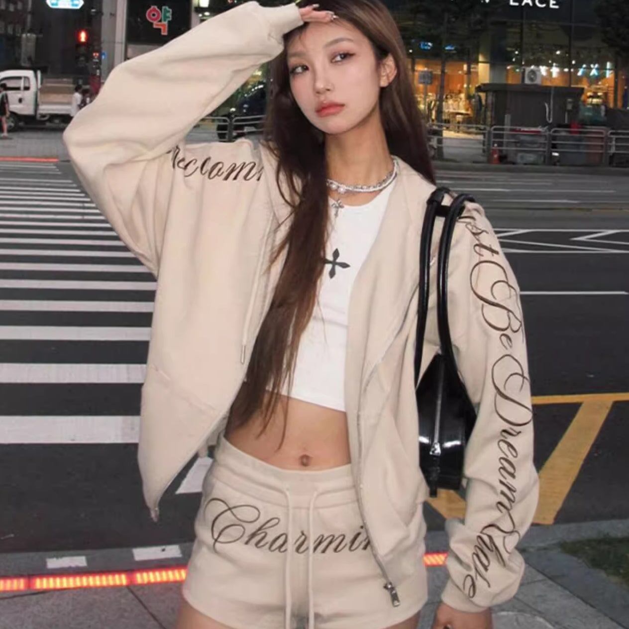 スウェットセットアップ レディース 韓国 ファッション ショートパンツ ベージュパーカー ロゴプリント ジップパーカー