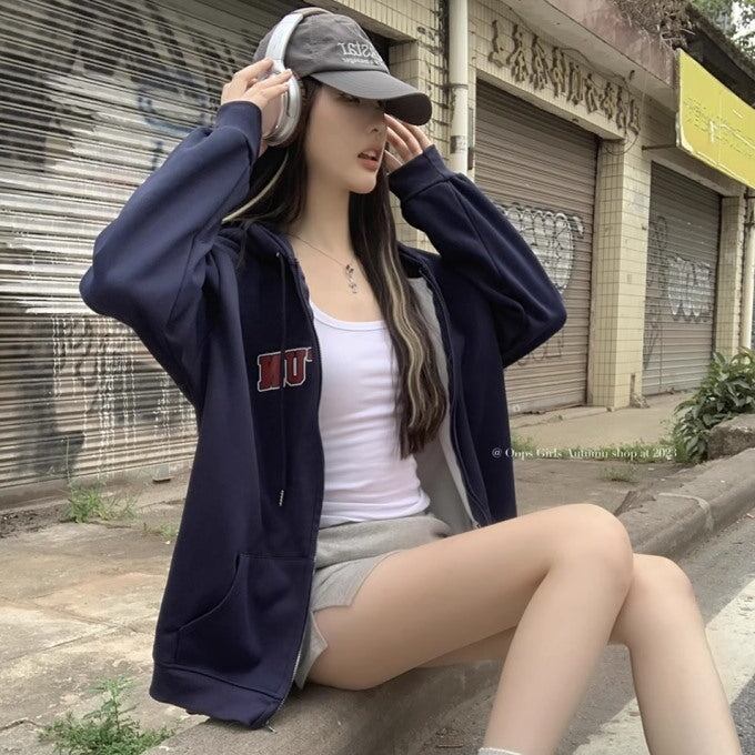 スウェットパーカー 長袖 レディース 韓国 ファッション ジップアップ ロゴパーカー 長袖 ネイビー ジャケット カジュアル フーディ 秋アウター