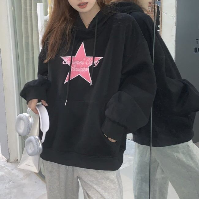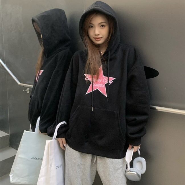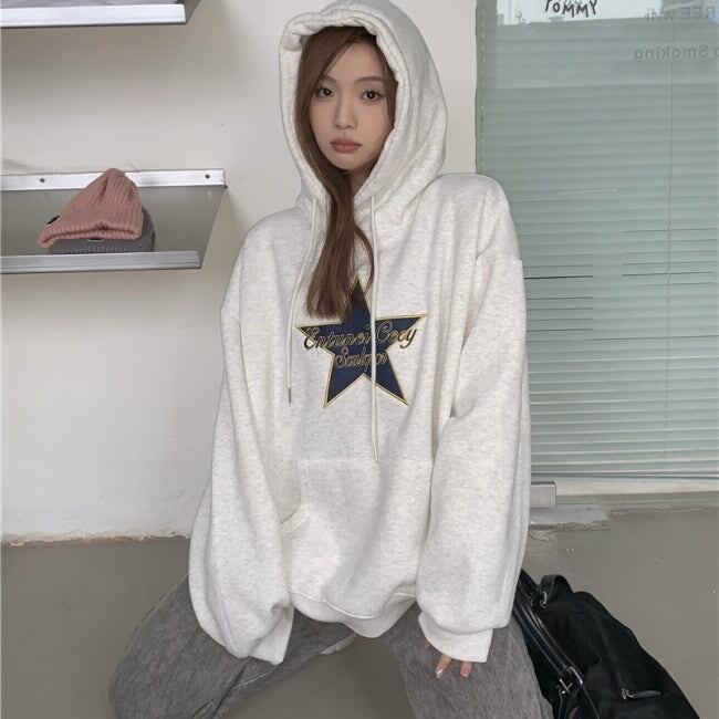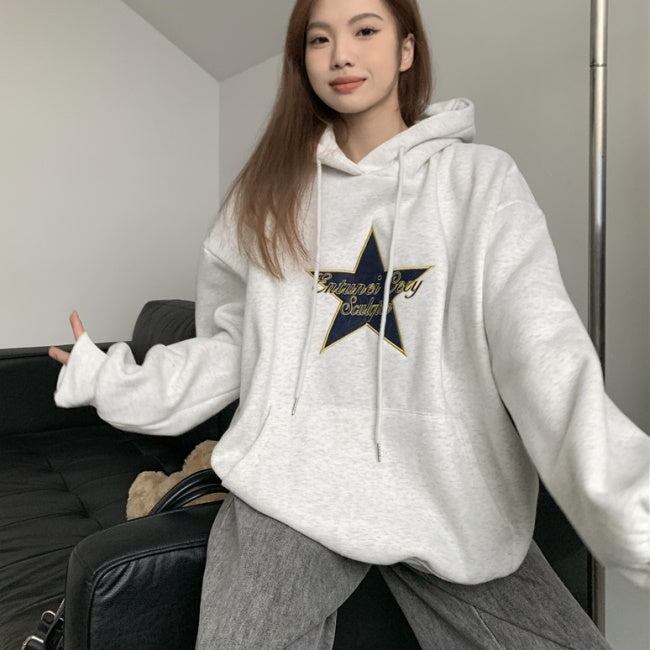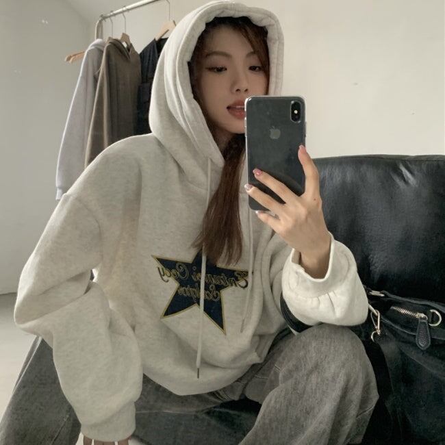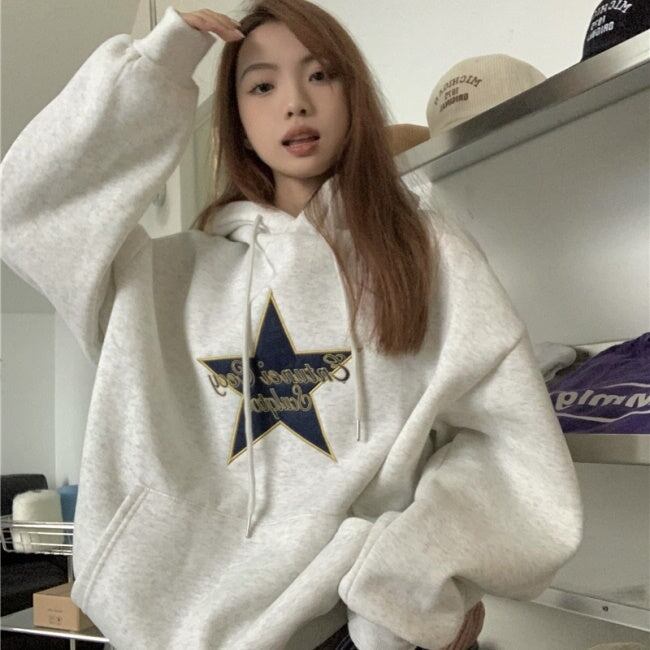 スウェット パーカー ビッグサイズ レディース 韓国 ファッション スター柄 パッチ ロゴ プルオーバーパーカー 厚手 裏起毛