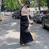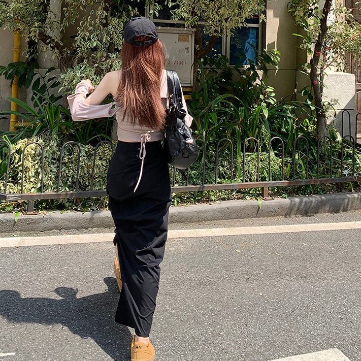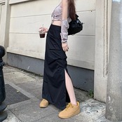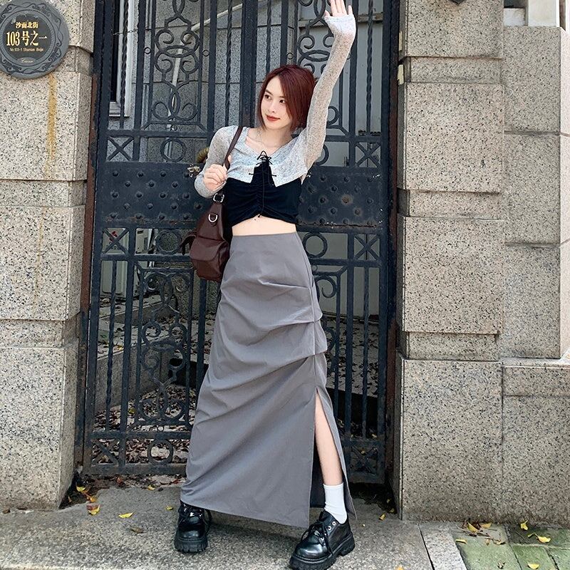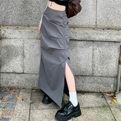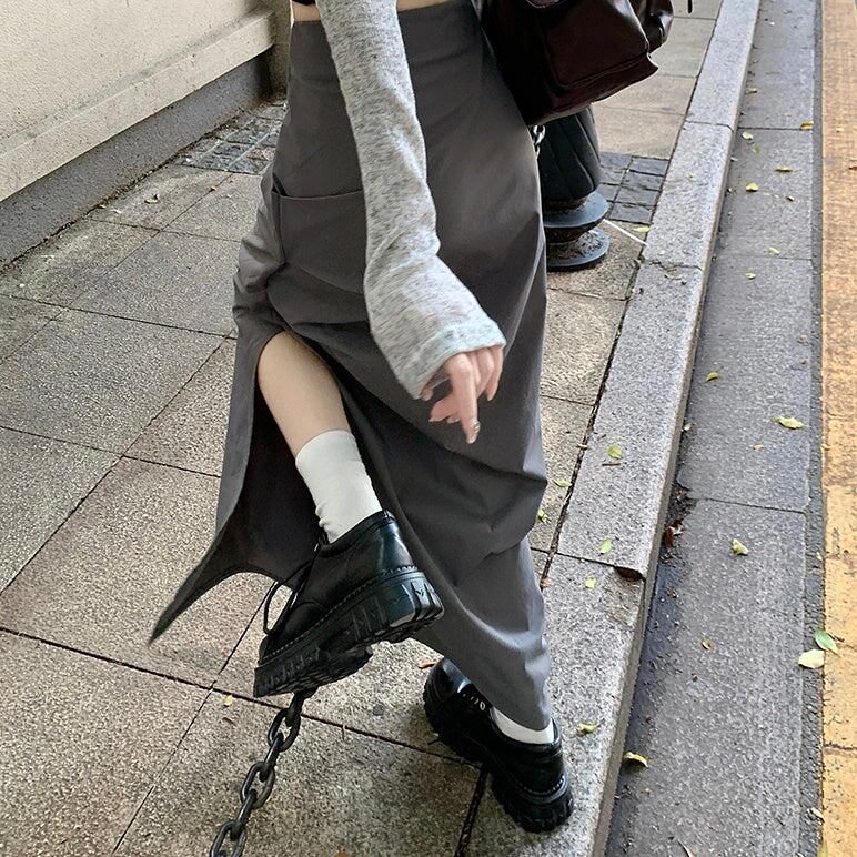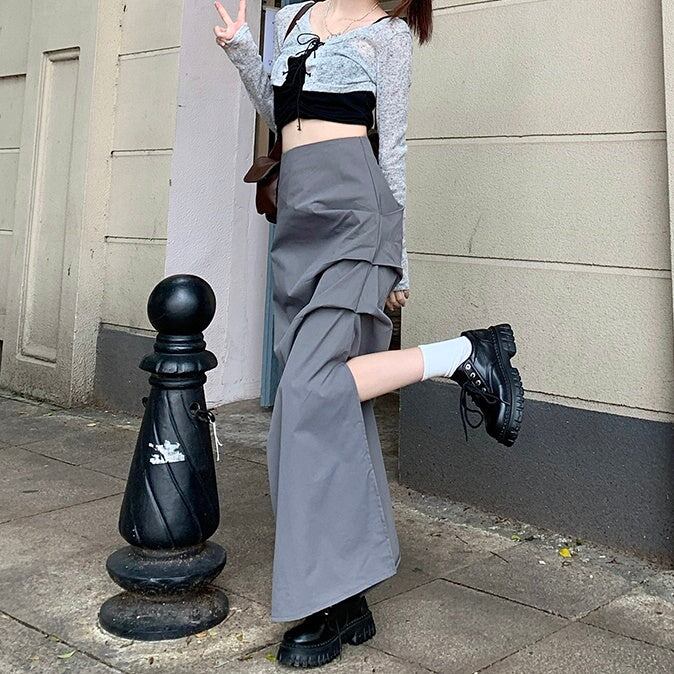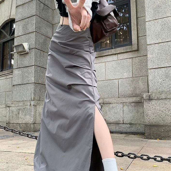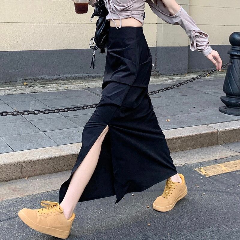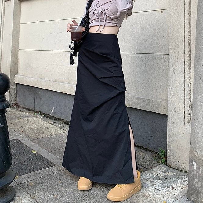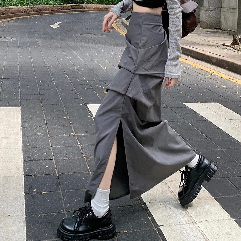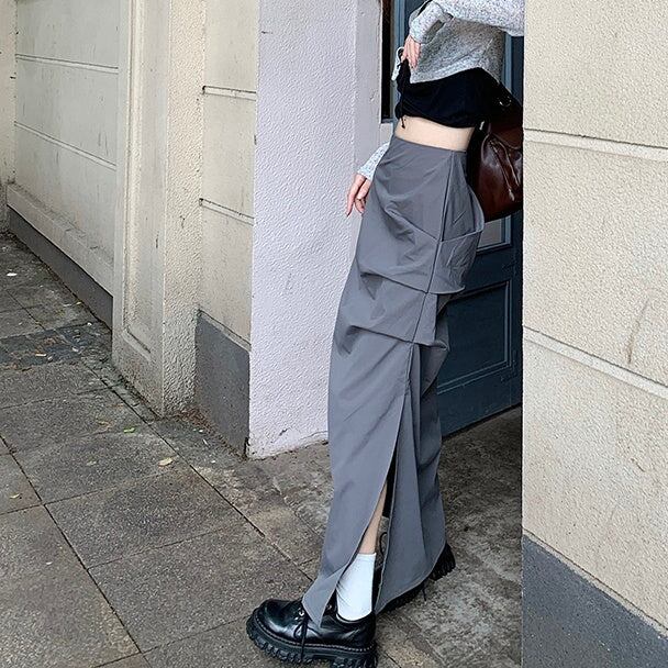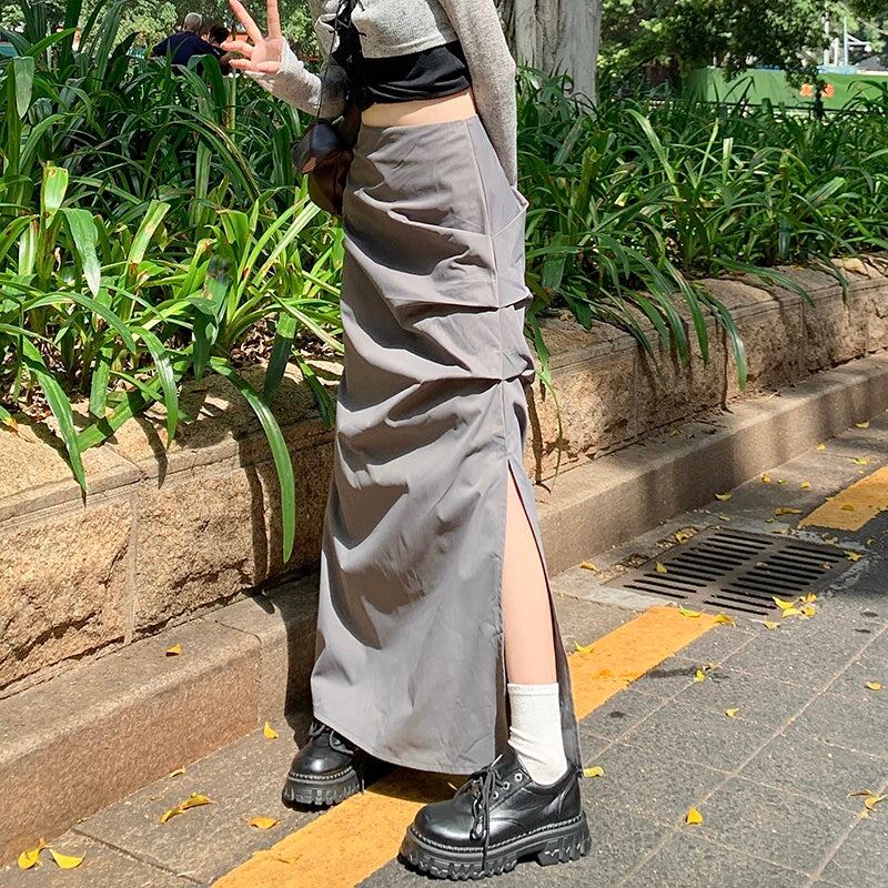 ロングスカート 韓国 アシメトリー シャーリング サイドスリット ペンシル スカート