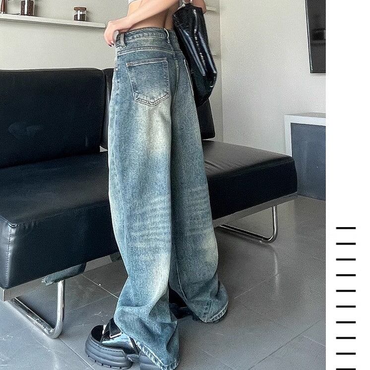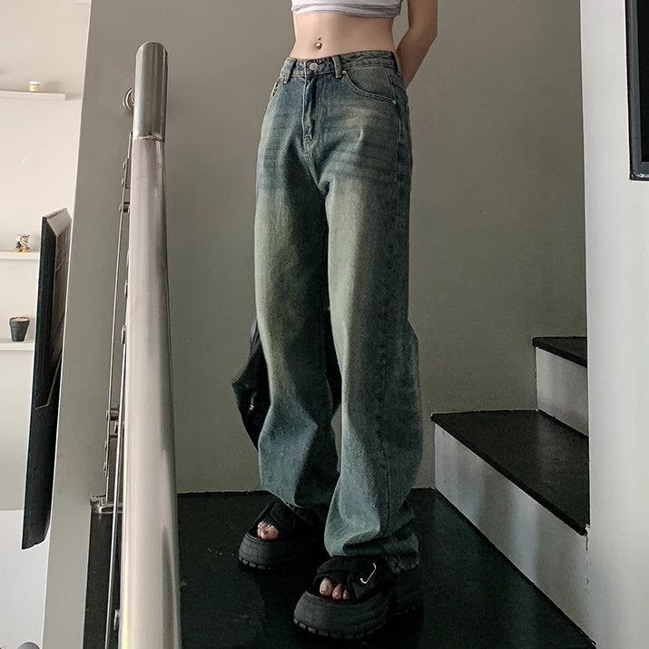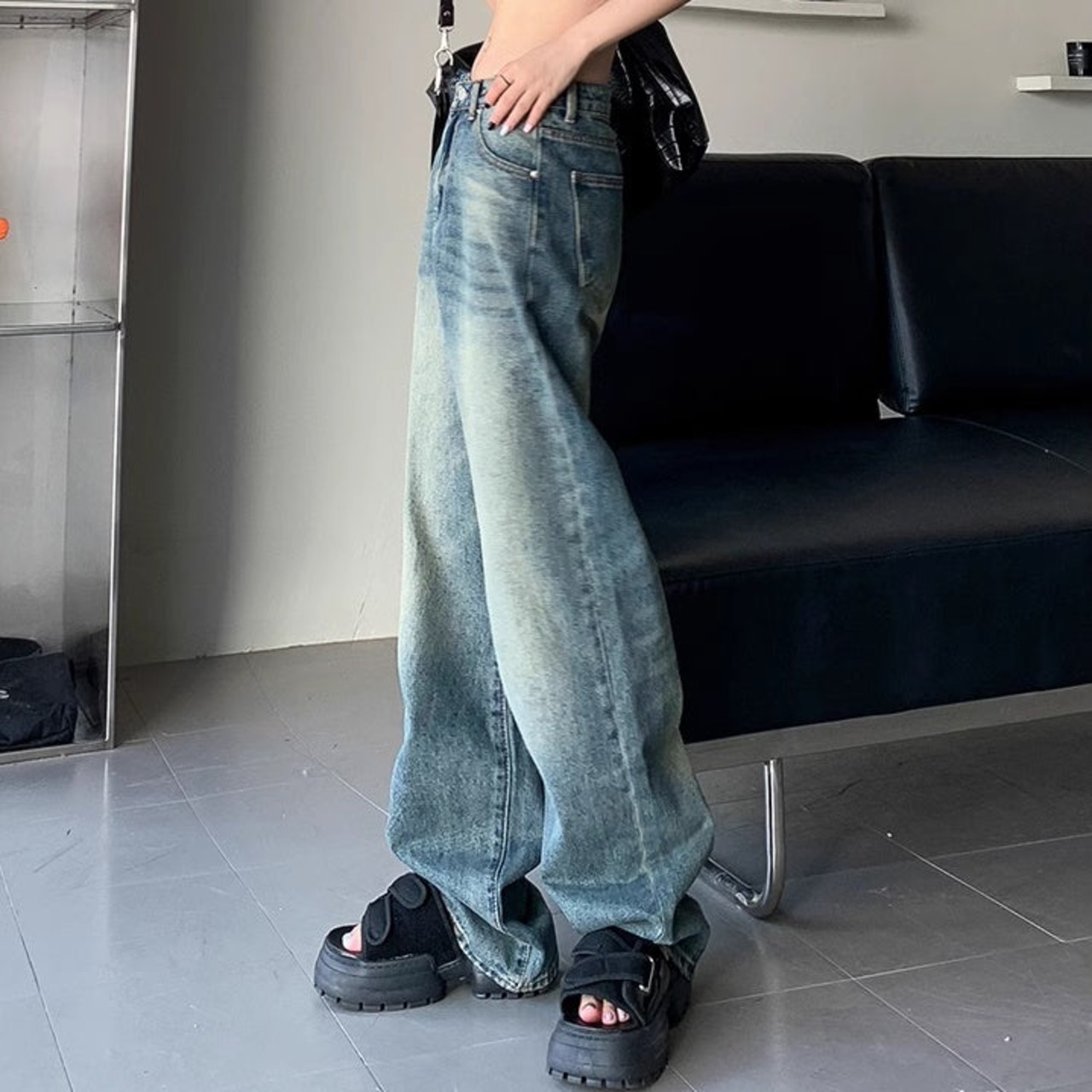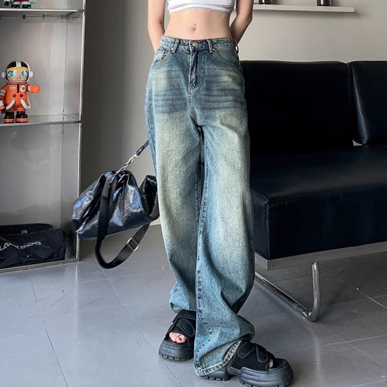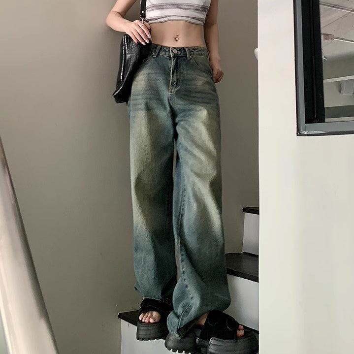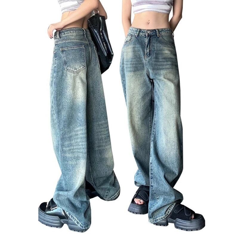 ワイド デニムパンツ レディース ストレート 韓国 ファッション ユーズド加工 夏 デニム